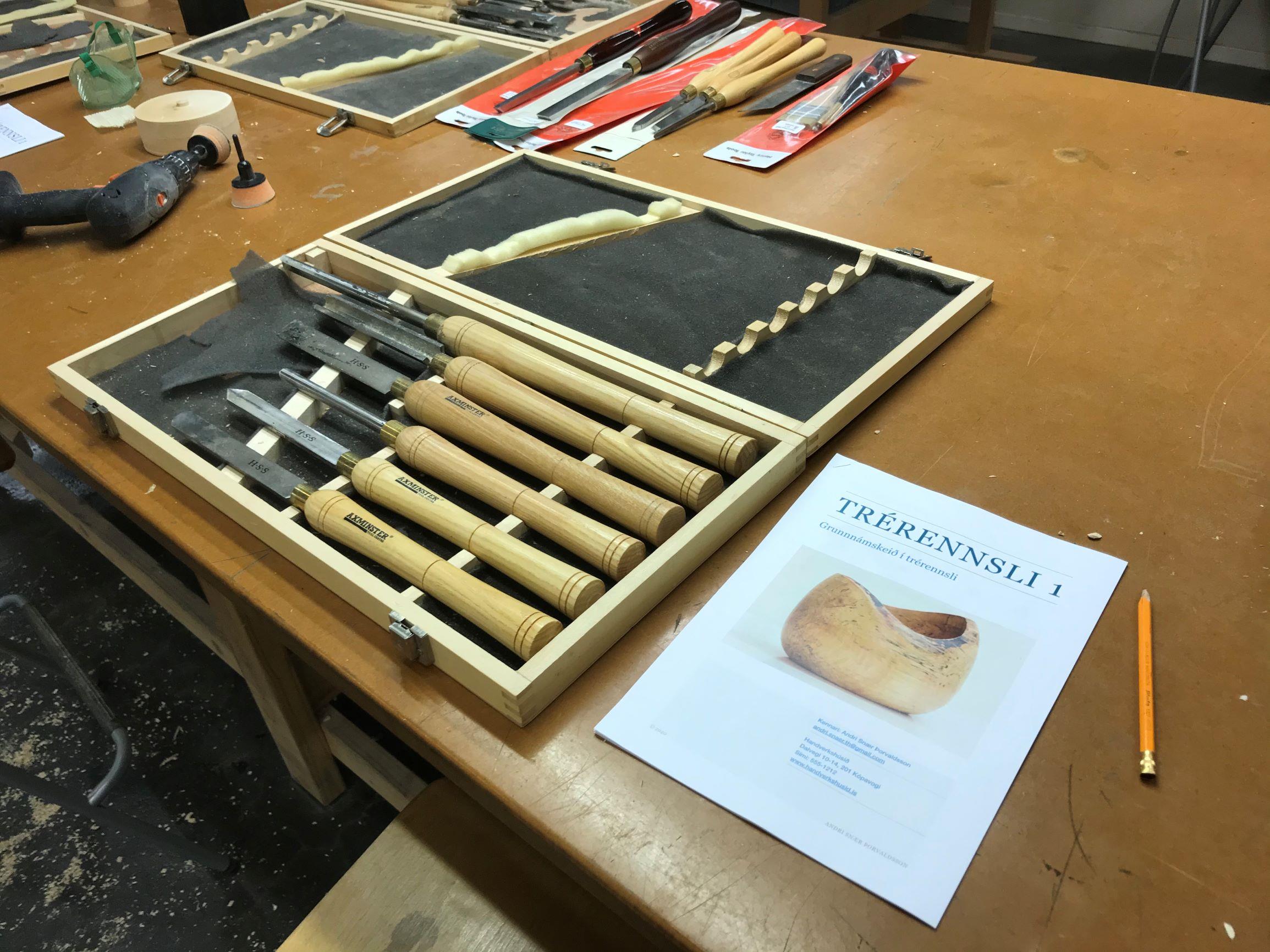 Þátttakendur þurfa ekki að taka neitt með sér. Þeir fá til afnota frábæra rennibekki í fullri stærð, úrval af rennijárnum, aukahlutum, sandpappír og yfirborðsefnum.